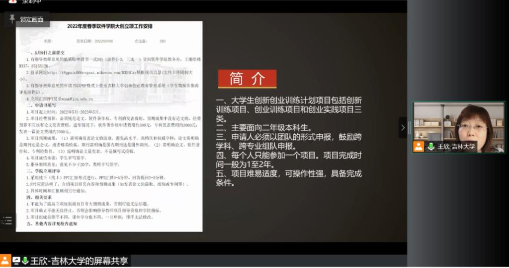 4月13日晚上19:00-20:30英国正版365官网大创项目系列讲座通过腾讯会议直播正式开始。第一场讲座是由计算机科学与技术学院副教授王欣带来的项目交流会。王欣老师从获得课外培养计划学分的主要方法,到参加保研综合面试的切身感受,再到指导大创项目的亲身经历,与同学们深入探讨了大学生做大创项目的意义。做大创项目好比用电钻在平滑的墙面上钻钉子,如果你找到合适的切入点,就可能对你的未来有一个重要的影响。接着,王欣老师与大家分享了组建大创团队以及申请书撰写的注意事项,并用自己申报学校项目举例告诉大家撰写大创项目的申请书很重要,规范申请书格式也同样重要。讲座过程中,有同学就学习吃力是否适合做大创等问题与王欣老师进行了在线沟通。讲座最后,王欣老师希望通过本次讲座,助力同学们的创新创业小舟扬帆起航。