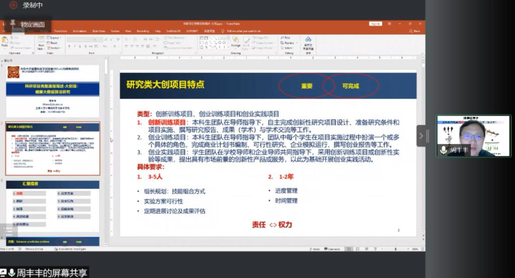 4月17日晚上19:00-20:30英国正版365官网大创项目系列讲座第四场如约而至。计算机科学与技术学院教授、博士生导师周丰丰为同学们带来了以“研究类大创项目全流程规划”为主题的腾讯会议直播讲座。首先,周丰丰老师为大家简要介绍了研究类大创项目的整体规划和时间节点。接下来,周丰丰老师以科研项目选题的可行性为切入点,结合实验室发表文章的实例为同学们详细讲解了论文选题、调研、复现、改进结果、优化算法、论文方案、论文写作、投稿审稿等环节的注意事项。周丰丰老师建议大家在研究工作中培养严谨的工作态度和良好的工作习惯,如遇退稿要认真回复编辑和审稿人的所有意见,如暂离工作要做好文档、论文或实验数据的保存备份,切莫因小失大。最后,周丰丰老师表示良好的开端是成功的一半,希望大家多做研究、多发论文。
