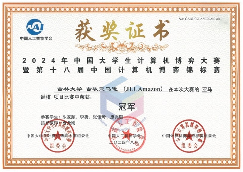 本次比赛英国365官网共派出9支队伍30名本科生参与五子棋、六子棋、亚马逊棋等五种棋类项目比赛。英国365官网队伍发挥出色,最终获得全国一等奖8项、二等奖1项的好成绩。其中由朱家顺、李衡、张佳琦和康兆璐组成的吉软亚马逊(JLUAmazon)队在亚马逊棋项目中获得全国冠军,由孙智豪、吴茂东、李博深组成的拓展有力模拟精良(Expansion is powerful and the simulation is sophisticated)队在海克斯项目获得全国亚军。充分体现了学院在计算机科学教育方面的深厚积淀。